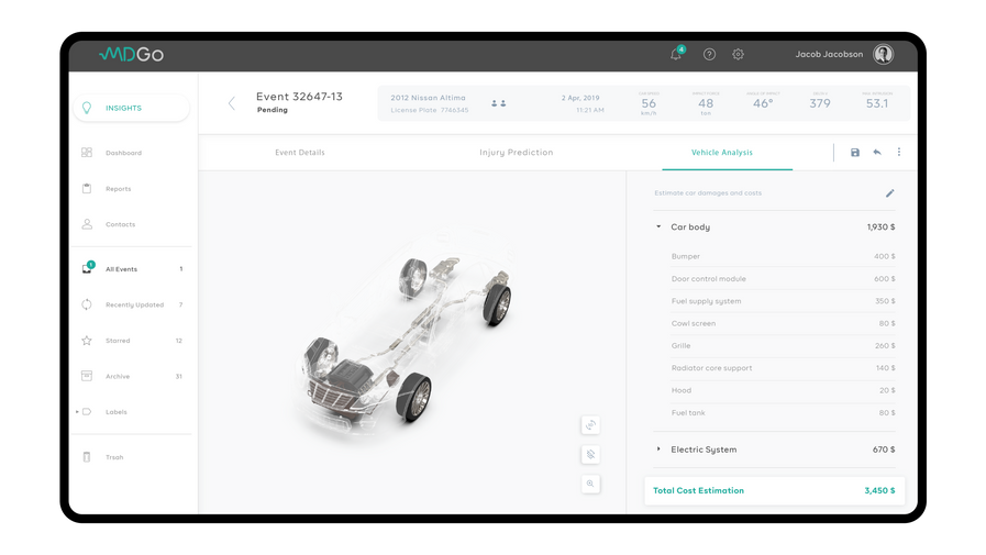 MDGo's technology is designed for use by insurance companies and medical emergency teams as it analyzes the forces that were applied on the vehicle and on the different organs of the occupants.